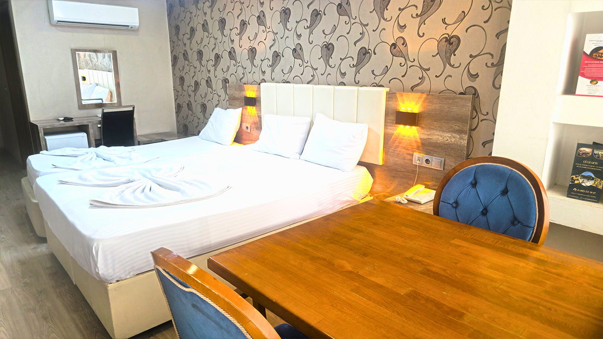 Gülizar Butik Hotel’in Double Odası, iki kişilik konaklamalar için konforlu ve şık bir atmosfer sunar. Odamızda isteğe bağlı olarak bir adet çift kişilik yatak ya da iki ayrı tek kişilik yatak seçeneği bulunur. Çiftler, arkadaşlar ya da iş seyahati yapan misafirler için ideal olan double odamız, hem estetik hem de fonksiyonel detaylarla donatılmıştır.